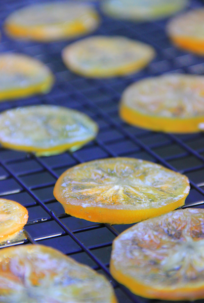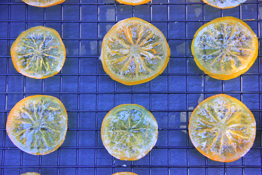 Add lemon slices, carefully trying to spread them out over the top of the skillet. Allow the lemons to simmer for approximately an hour, being sure that the rinds are translucent before removing. Once ready, remove the lemon slices and cool them on a wire rack.