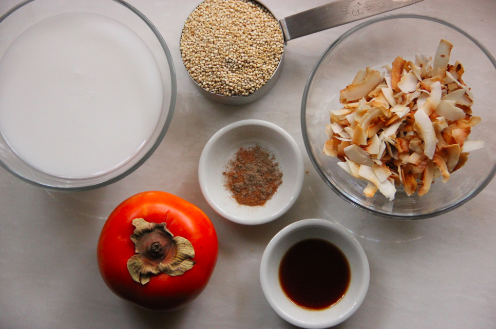 Craving something new but equally hearty and warm, I decided on a quinoa breakfast ‘porridge’. While I’m used to cooking my quinoa in chicken or vegetable stock when preparing a salad or side dish, I opted for coconut milk and topped it with fresh persimmon, toasted coconut flakes and a splash of almond milk.