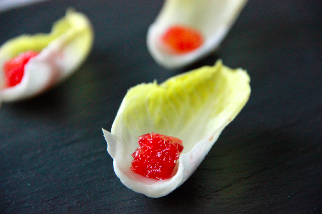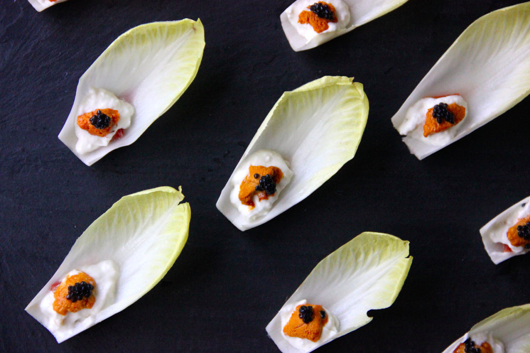 Belgian Endive Spears with Uni, Burrata and Blood Orange