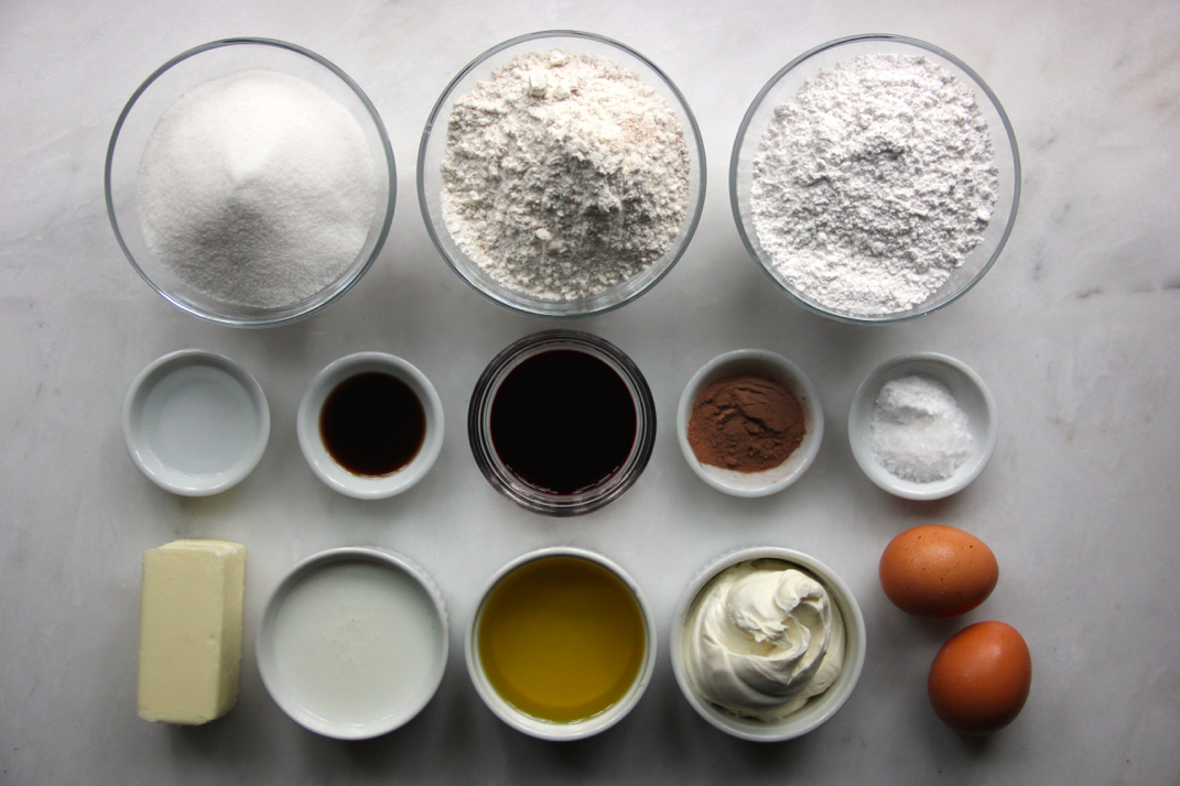 Beat eggs in a bowl or stand mixer. Slowly add the oil, buttermilk, vinegar and vanilla while mixing