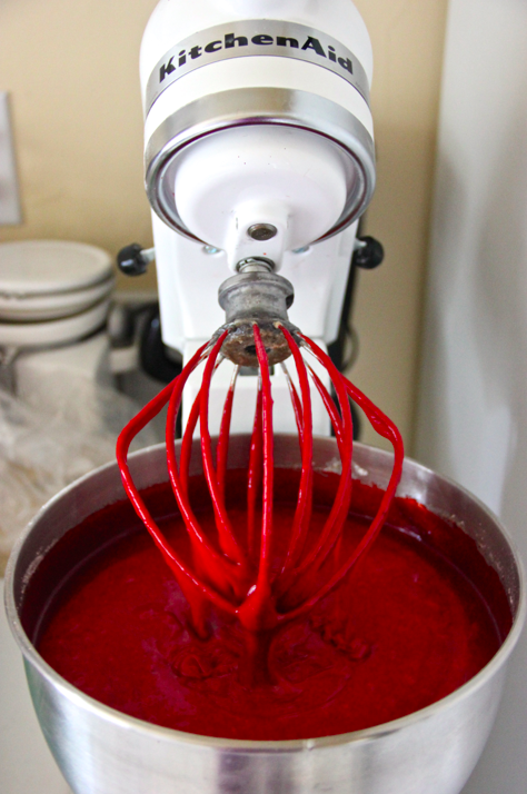 Turn the speed of the hand or stand mixer down and carefully add red food coloring, being careful that it doesn’t splash when being mixed in (it stains!)