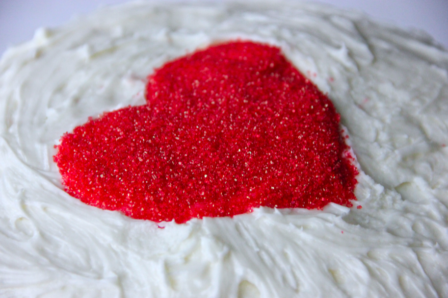 For a fun and super easy decoration, you can use a cookie cutter (I used a heart) and place it on top of the cake, ensuring the edges all touch the frosting. Then, fill with sprinkles of your choice before carefully removing the cookie cutter! Easy and fun!