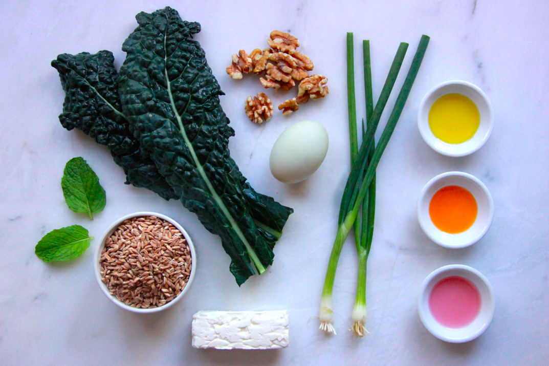When farro is ready, drain and pour cooked farro back into pot. Stir in crumbled feta, toasted walnuts, oil and vinegar mixture, kale, mint and green onion