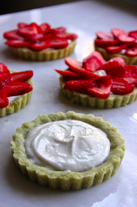 Spread the sliced strawberries evenly across the top of the tart(s), starting with the outermost layer using the larger slices, and moving inward using smaller slices as you go