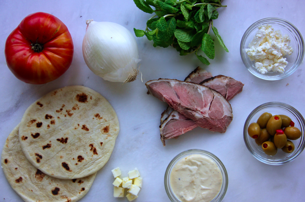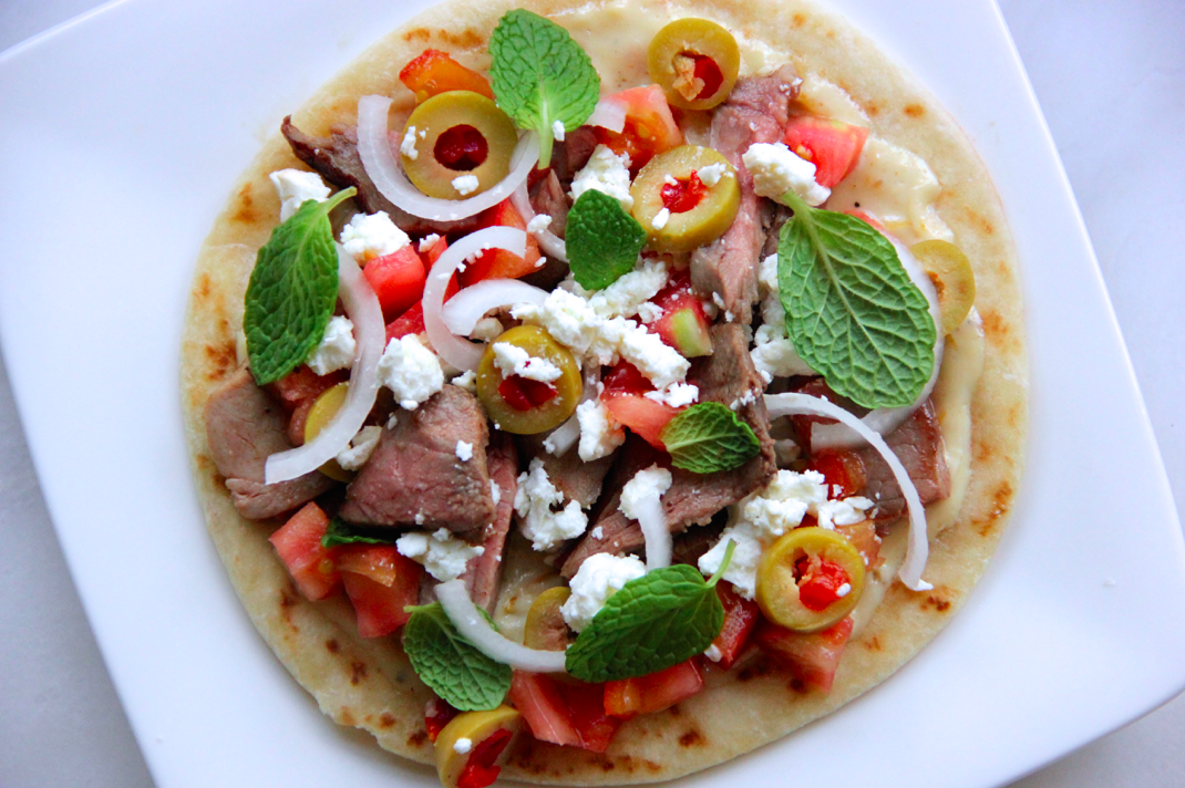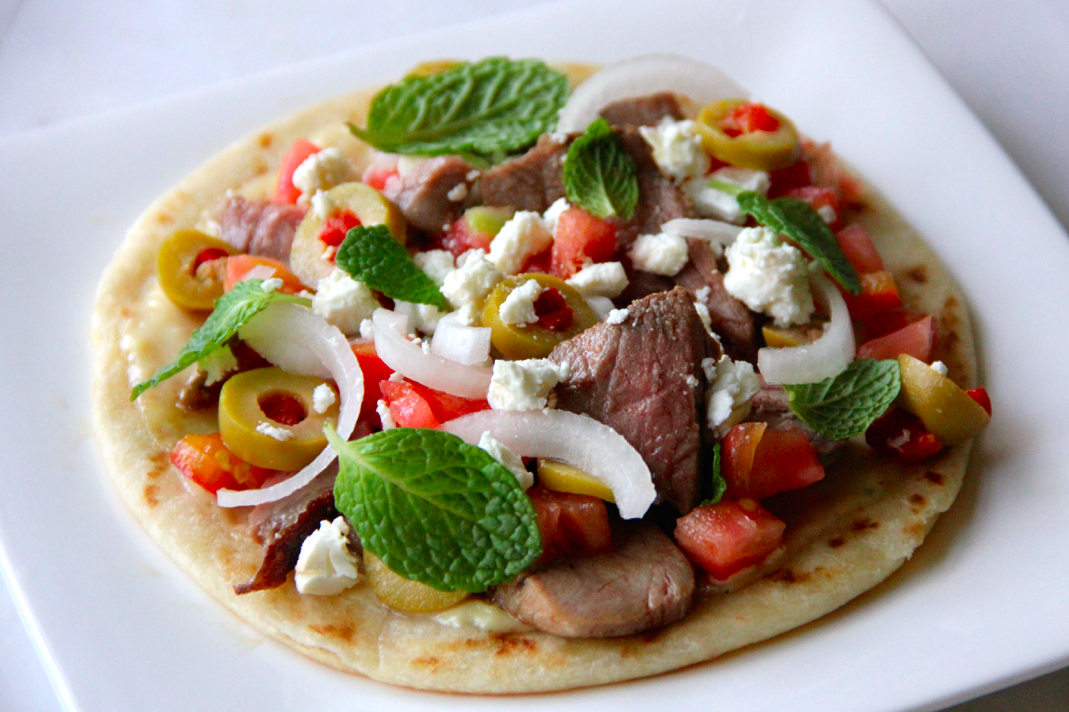 In the spirit of not being wasteful, I incorporated the leftover lemon and garlic aioli from the BLT scallop bites featured in last week’s blog post. The aioli and lamb were meant for each other, giving me a new found appreciation for this sauce which pairs just as beautifully with seafood as it does with red meat. Seriously though, I’m talking a perfect marriage of flavors…… like peanut butter and jelly, or even steak and potatoes. We spread the aioli liberally over flat bread with sliced pimiento olives, mint, white onion, tomato and feta.